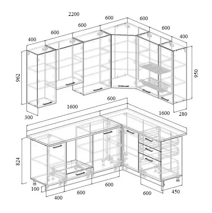 Артикул: A60143Угловой кухонный гарнитур Шампань 2200х1600 мм, столешница 38 мм